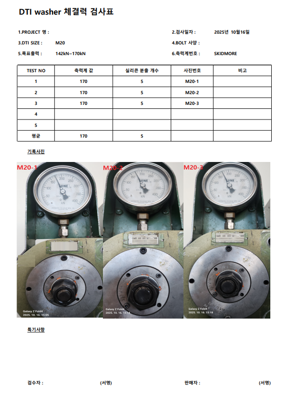 상기와 같은 양식으로 규격별 DTI washer 체결력 검사표에 실리콘(Silicon) 분출량 및 축력계값을